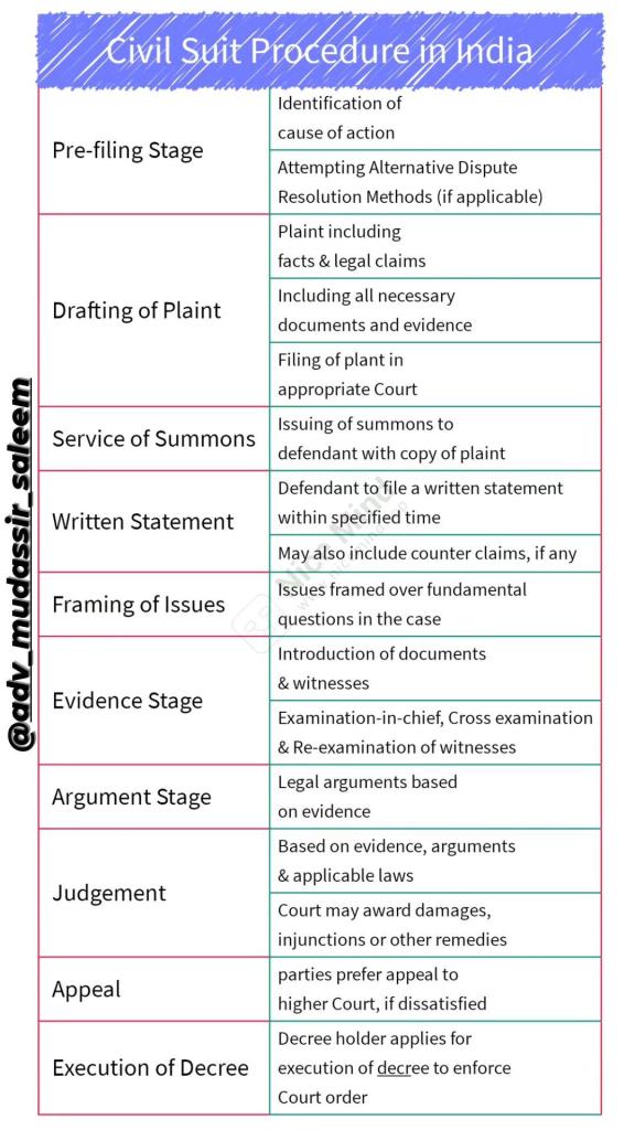 Stages of a Civil Suit in India Posted byAdvocate Md Mudassir SaleemSeptember 11, 2023Posted inUncategorized The following are the stages of a Civil Suit that are observed by the Indian Court of Law: Share this: Click to share on X (Opens in new window) X Click to share on Facebook (Opens in new window) Facebook Like Loading... Related